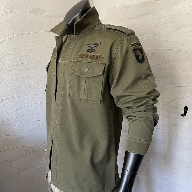 US ARMY101 AIRBONEをイメージした長袖シャツは、ミリタリーテイストを日常着に取り入れたい方におすすめです。落ち着いたオリーブカラーと、さりげなくデザインされたパッチが、大人の余裕を感じさせる一着。カジュアルな着こなしにも、より洗練された雰囲気をプラスします。普段使いから、休日のちょっとした外出まで幅広く活躍する、着回し力の高いアイテムです。