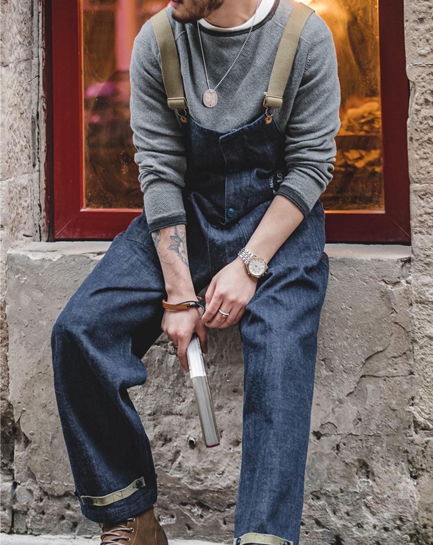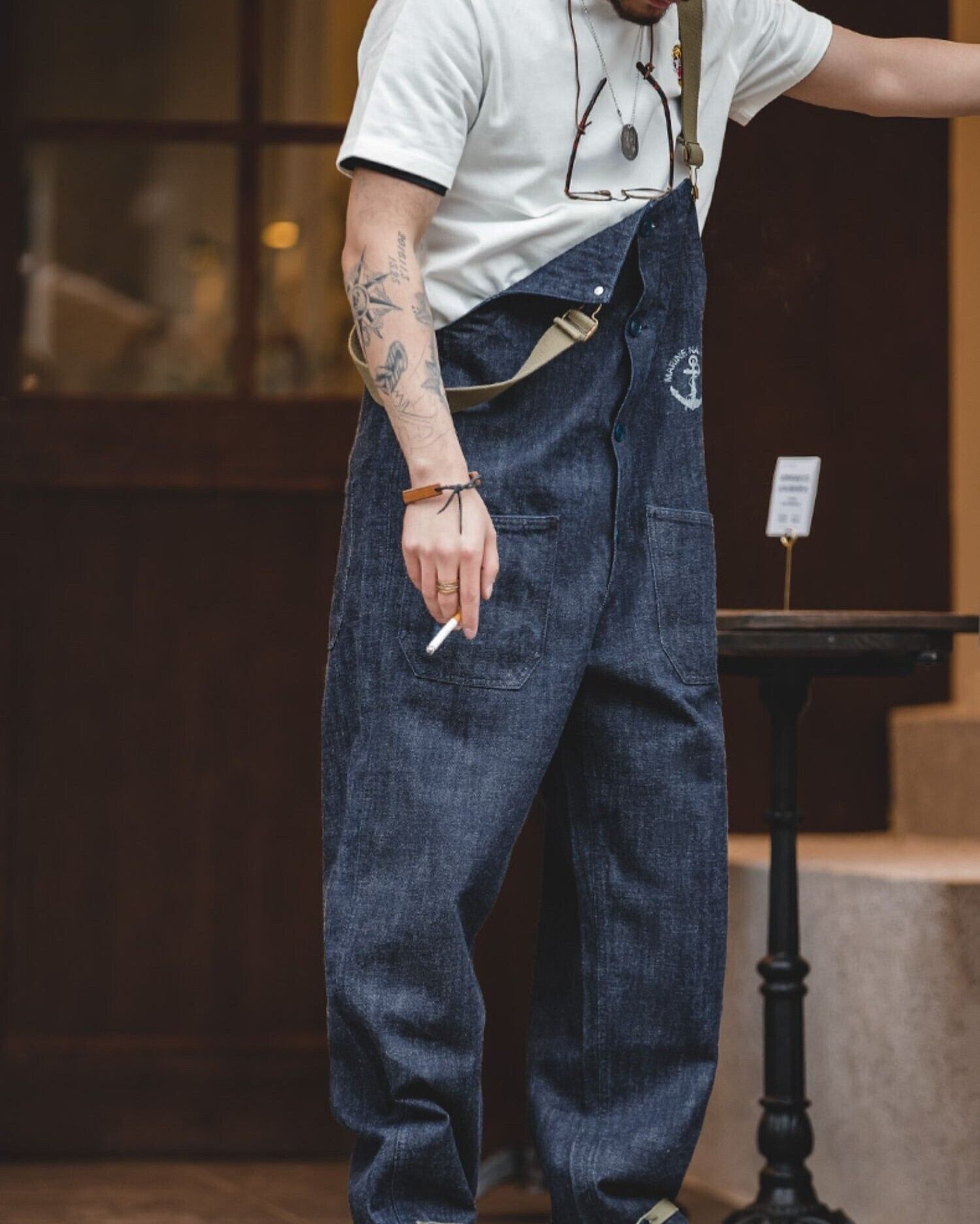 アメリカンレトロな雰囲気漂うデッキオーバーオールです。ネイビーカラーの落ち着いた色合いと、さりげなく施された錨の刺繍が、大人のカジュアルスタイルを演出します。普段使いはもちろん、休日の街歩きやアウトドアにも最適な一着です。着こなしやすいデザインで、様々なコーディネートに合わせやすく、幅広いシーンで活躍します!