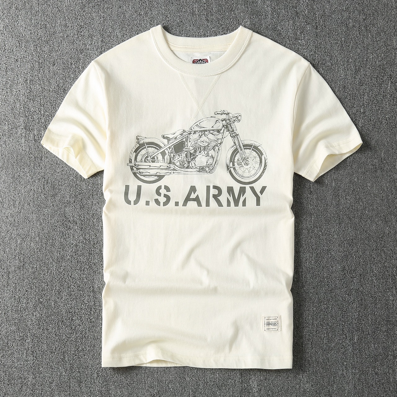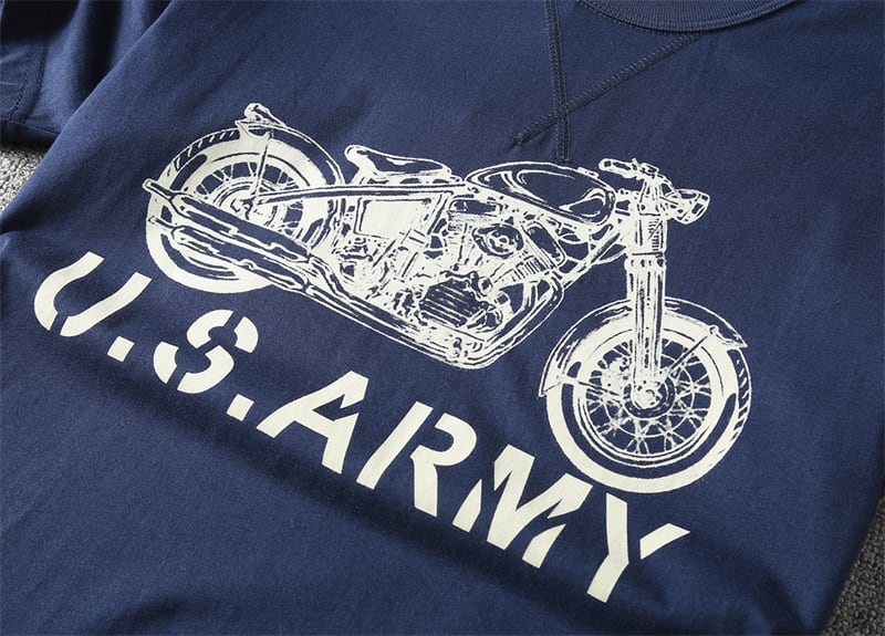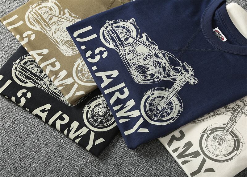 U.S.ARMYとバイクのプリントがクールな半袖クルーネックTシャツは、カジュアルなスタイルにミリタリーテイストをプラスしたい方におすすめです。バイクのイラストは、力強さを感じさせるデザインで、着るだけで個性を演出できます。普段使いはもちろん、休日の外出や友人との集まりなど、様々なシーンで活躍する一着です!