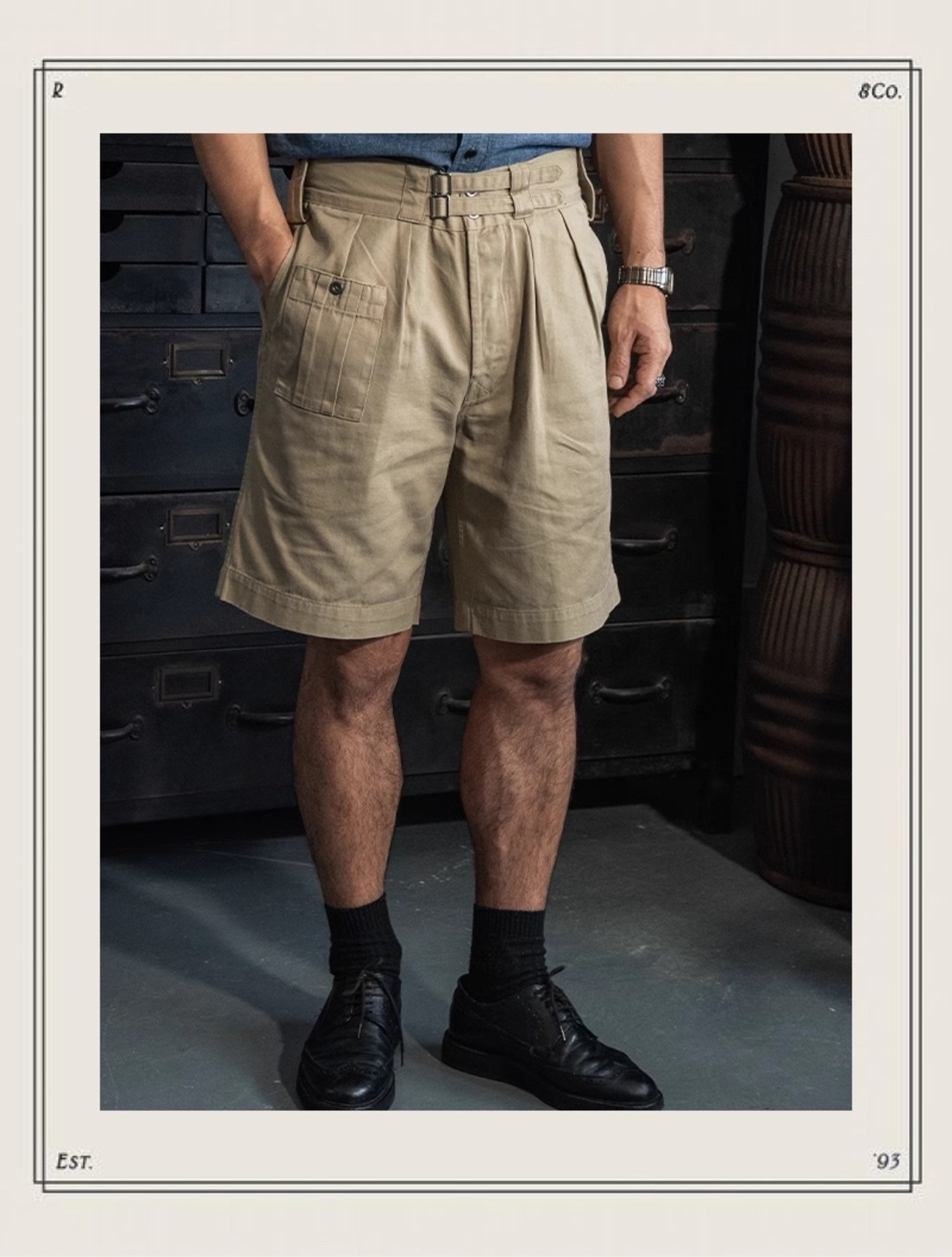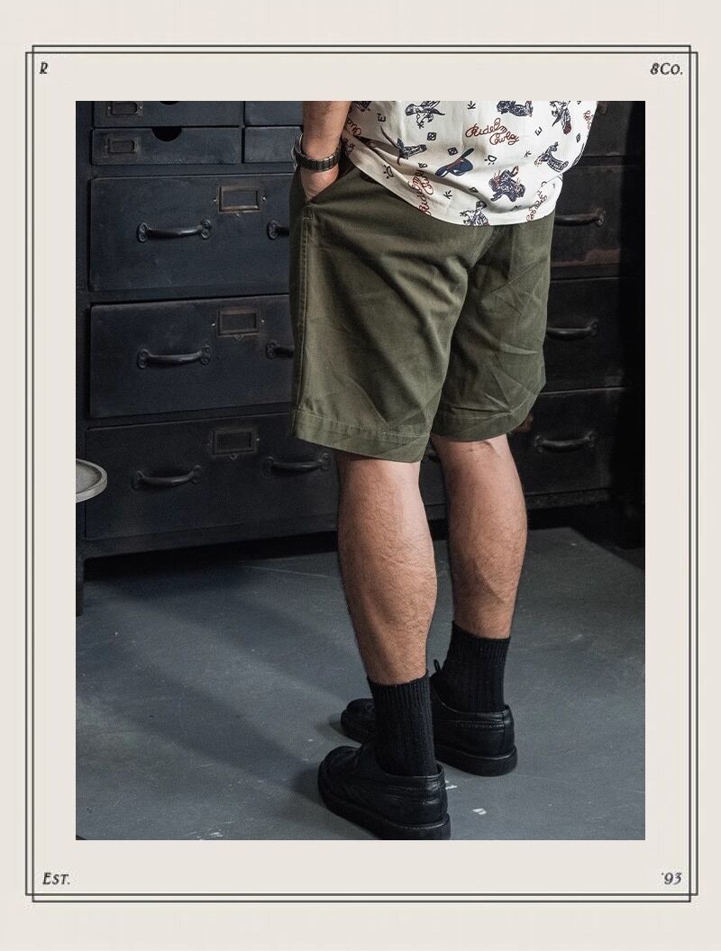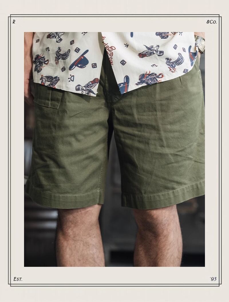 1941年、uk armyバトルドレスを忠実に再現したショーツ。時代を感じさせるダブルボタンのウエストベルトと、実用的なサイドポケットが特徴です。ミリタリーテイストを取り入れつつ、現代的なシルエットに仕上げています。カジュアルなスタイルから、少し個性的な着こなしまで、幅広いコーディネートに活躍します。