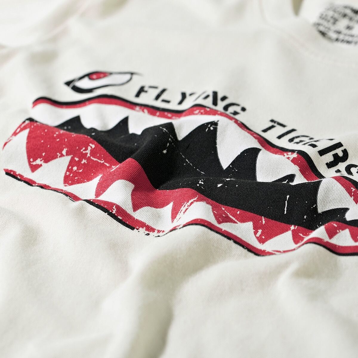 この長袖Tシャツは、ヴィンテージ感あふれる「フライングタイガース」の象徴的なサメの歯デザインが魅力です。シンプルながらもインパクトのあるデザインは、カジュアルなスタイルをワンランクアップさせます!普段使いはもちろん、ちょっとしたお出かけにも最適。一枚持っていると重宝するアイテムです!