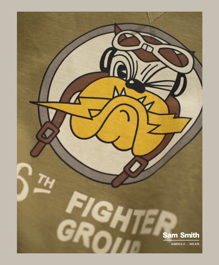 ミリタリーテイスト漂うクルーネックスウェットシャツで、スタイリッシュなカジュアルスタイルを演出!胸元には、56th Fighter Groupのロゴと、迫力満点のブルドッグのグラフィックプリントが施され、存在感抜群の一着です。普段使いはもちろん、休日のお出かけにも最適!着心地の良さも魅力です。