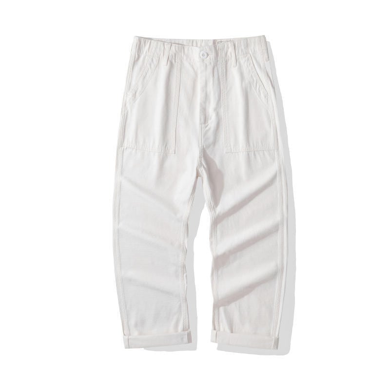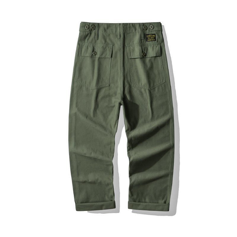 ミリタリーテイストのカーゴパンツ。厚手の生地を使用し、秋冬の着用に適しています。両サイドのポケットは収納力が高く、機能性も兼ね備えています。