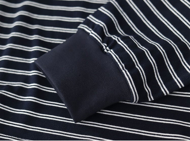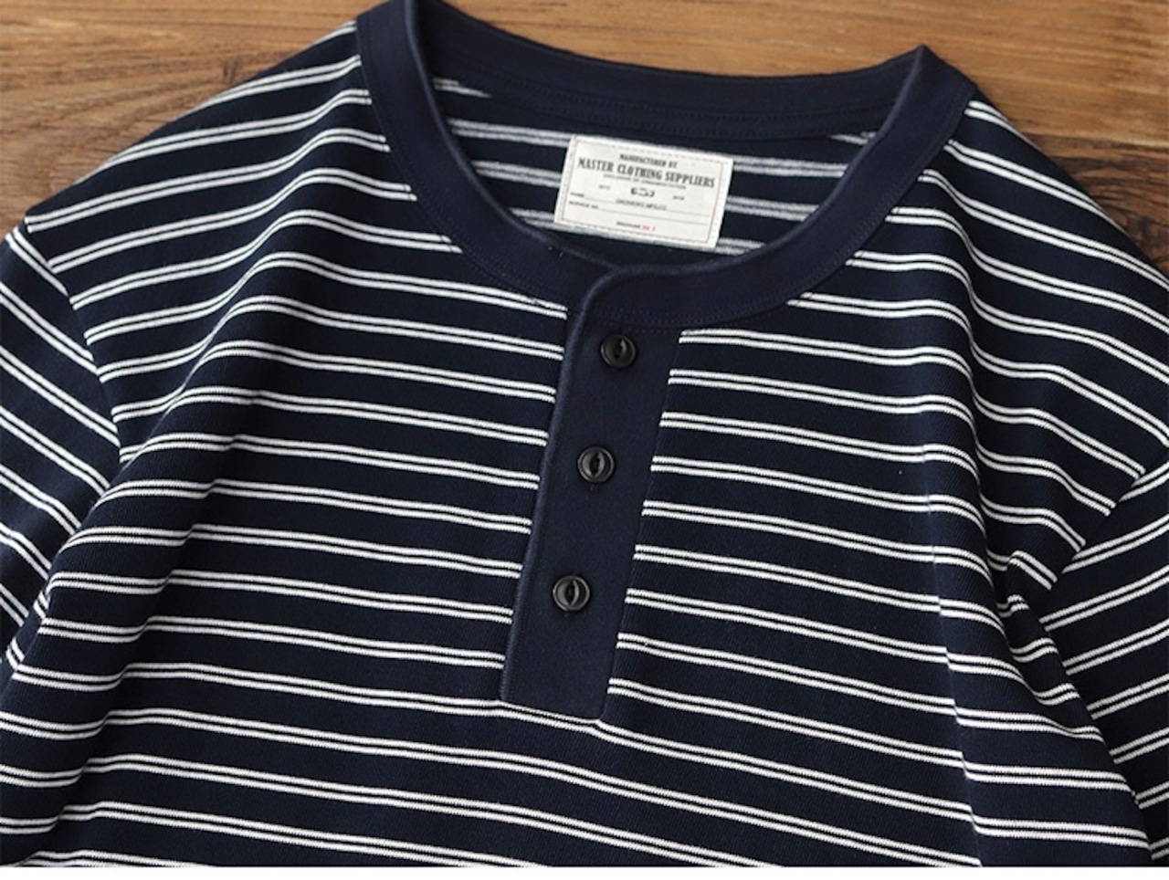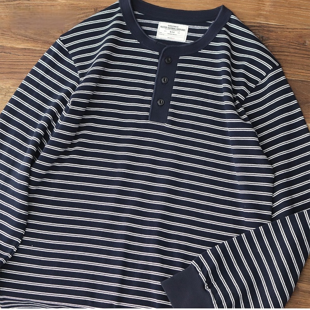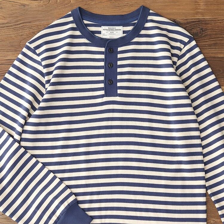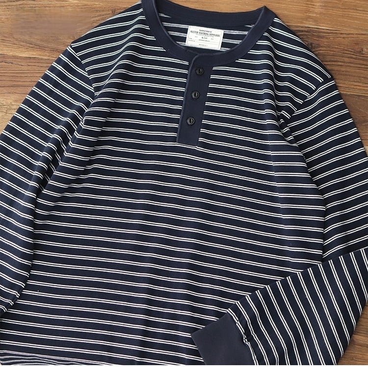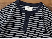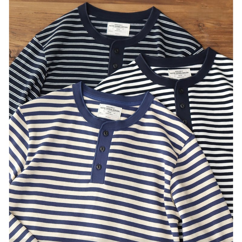 厚手の純綿を使用した長袖Tシャツは、快適な着心地で、デイリーユースに最適です。ストライプ柄がアメカジスタイルを演出し、ヘンリーネックのデザインが、さりげない個性をプラス。カジュアルな着こなしから、ちょっとしたお出かけまで、幅広く活躍する一枚です。