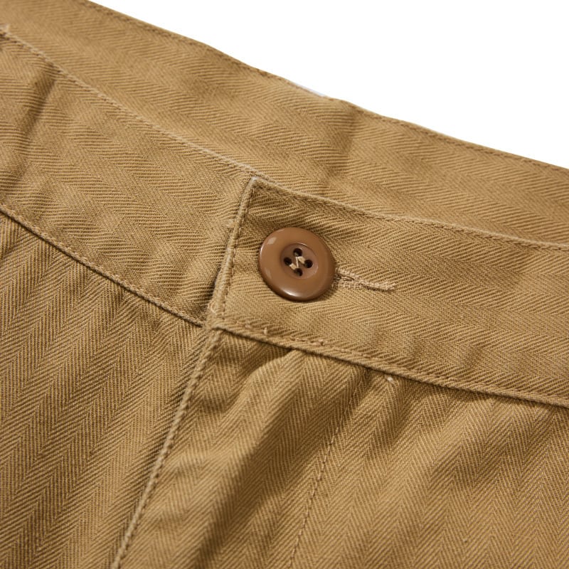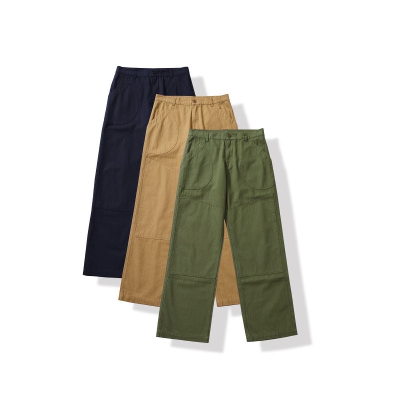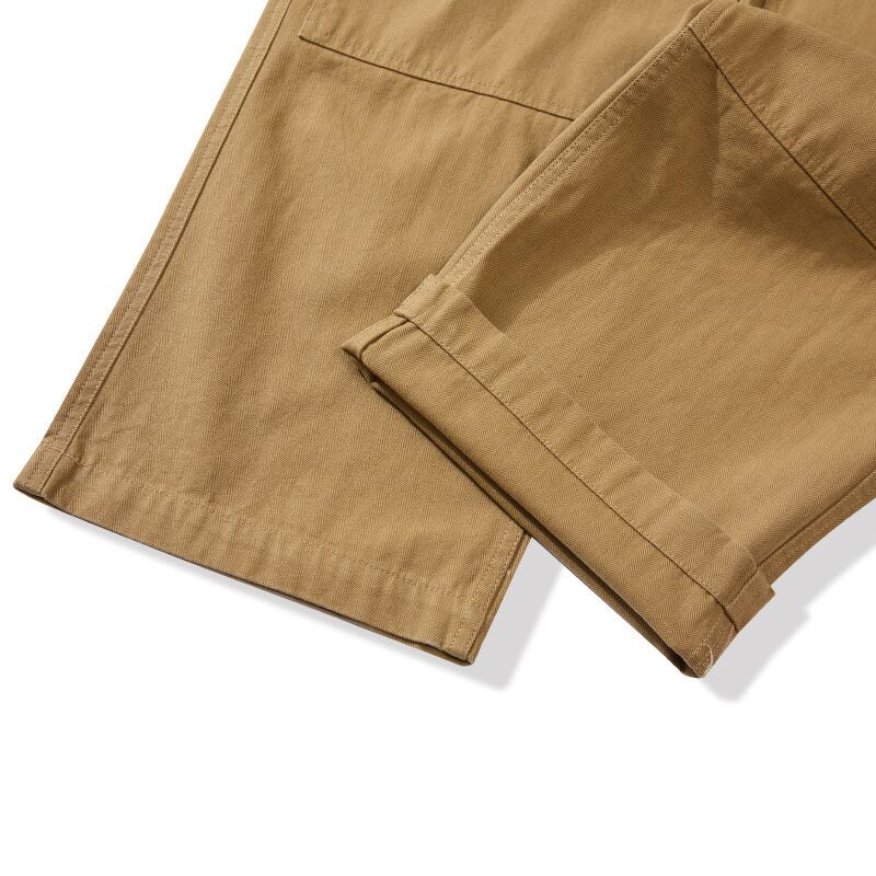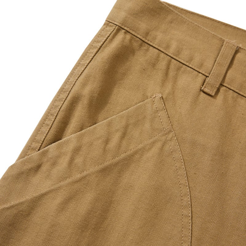 ヘリンボーン生地で仕立てられたカーゴパンツは、無骨な雰囲気が魅力。サイドやバックに配置された多機能ポケットは、普段使いはもちろん、アウトドアシーンでも活躍します。ゆったりとしたシルエットで、リラックスした着心地を提供します。オールシーズンでご使用いただけます。