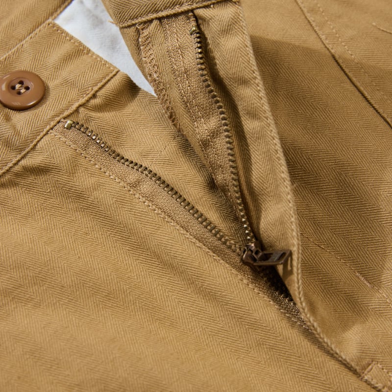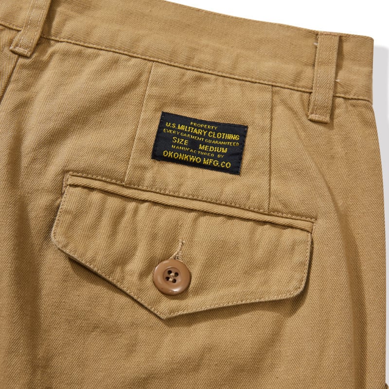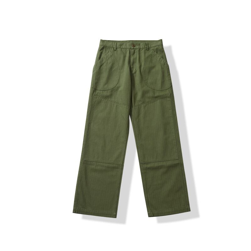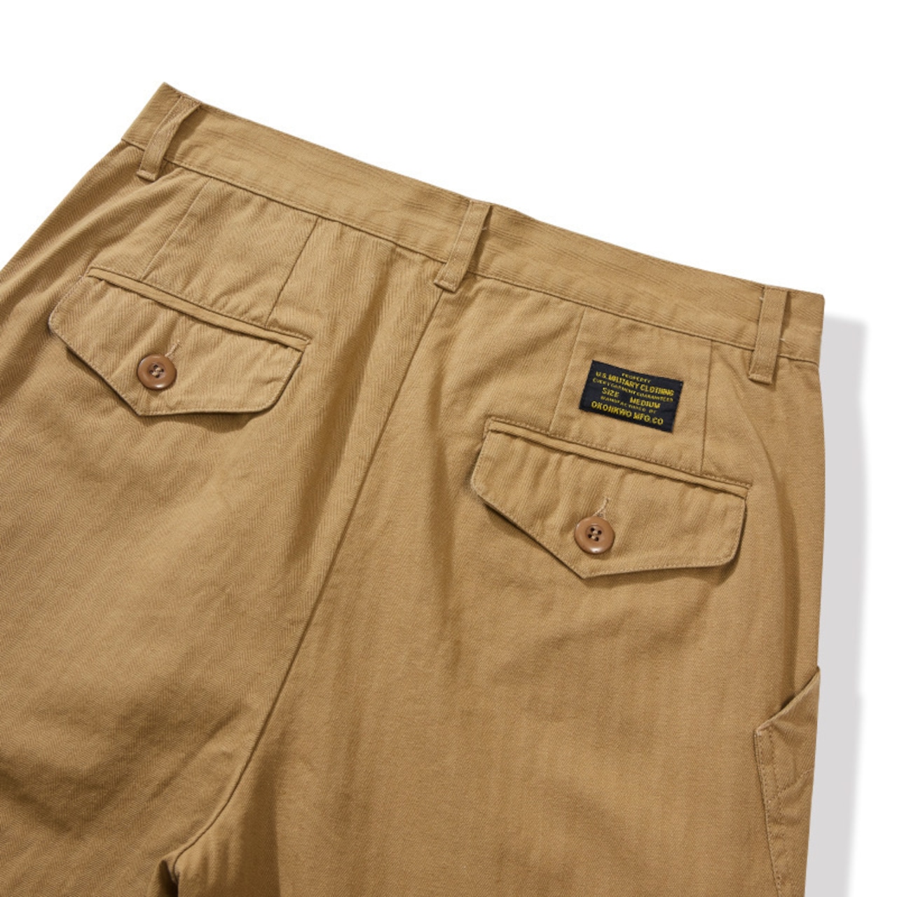ヘリンボーン生地で仕立てられたカーゴパンツは、無骨な雰囲気が魅力。サイドやバックに配置された多機能ポケットは、普段使いはもちろん、アウトドアシーンでも活躍します。ゆったりとしたシルエットで、リラックスした着心地を提供します。オールシーズンでご使用いただけます。