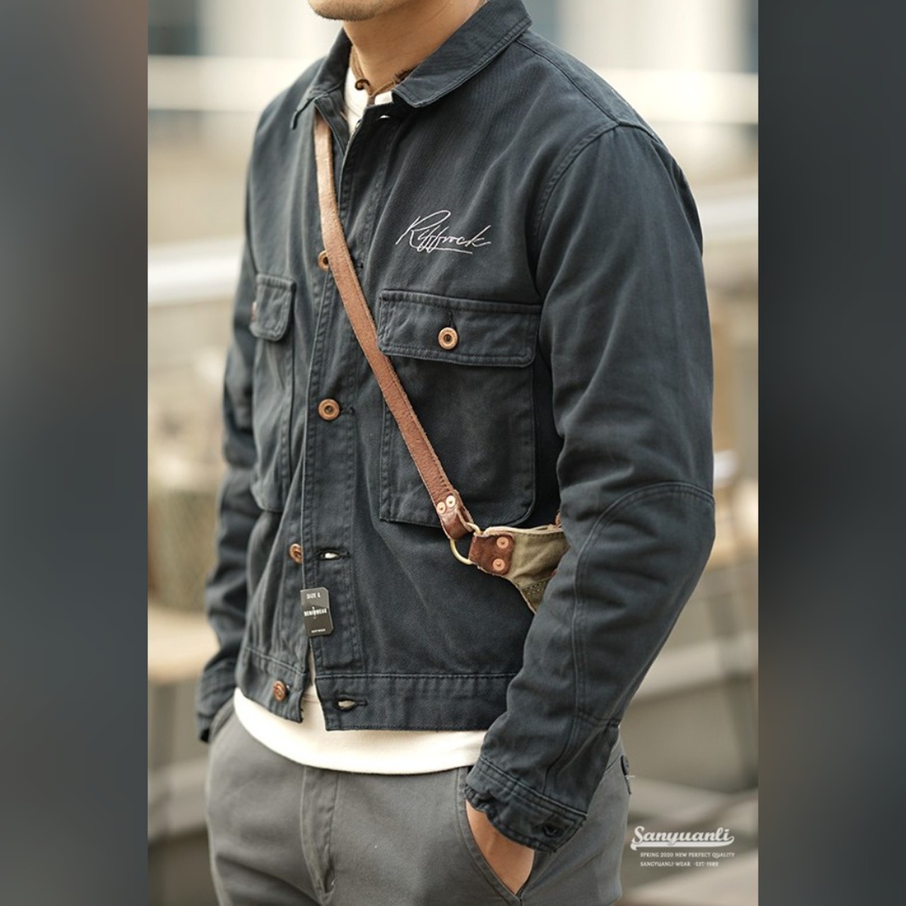 ヴィンテージ風のデザインが魅力のデニムジャケット。ワークウェアを思わせるヘビーウェイトな生地感と、ミリタリーテイストを漂わせるディテールが、落ち着いた大人な雰囲気を演出します。胸元にはさりげなく刺繍されたロゴがアクセントに。春秋の季節に羽織るだけで、カジュアルな着こなしをワンランクアップさせます。普段使いはもちろん、自転車通勤やちょっとしたお出かけにも活躍する一着です。